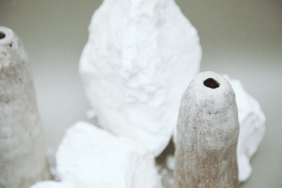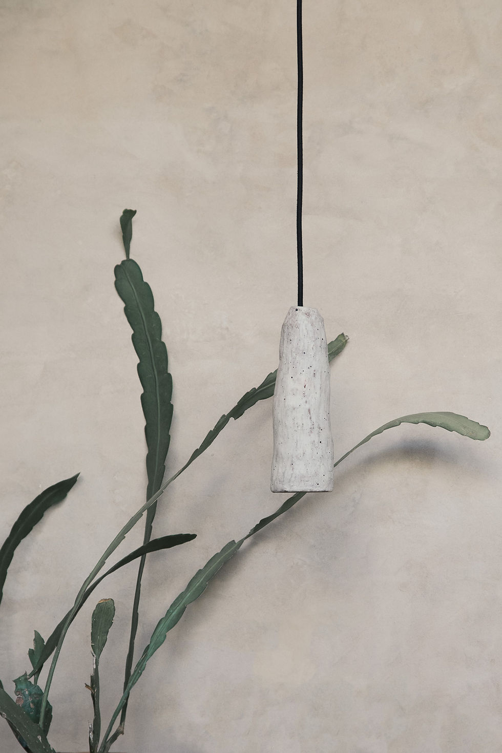 Snow Covered is a high-fired red ball clay pendant. The stoneware´s unique presence is characterised by its organic shape and irregularities in the mineral texture. A notable weight, massiveness, and unrefined rawness exudes from the pendant a brutalist aesthetic. The outer surface is roughly coated with a matte white glaze that allows the minerals to shine through. The inner part retains its natural red clay color.