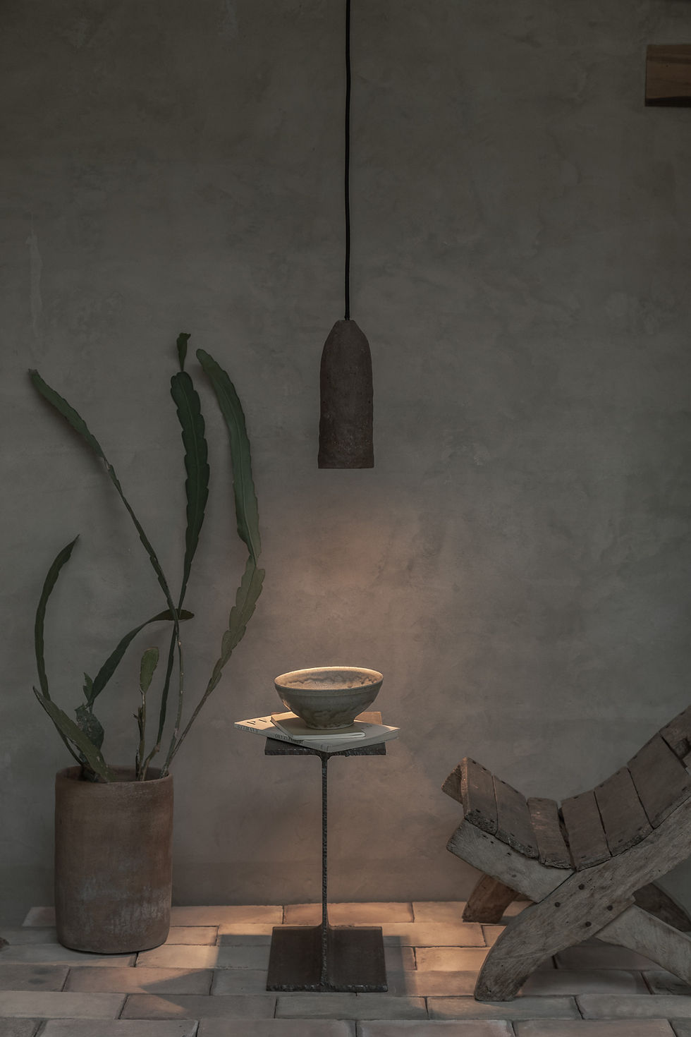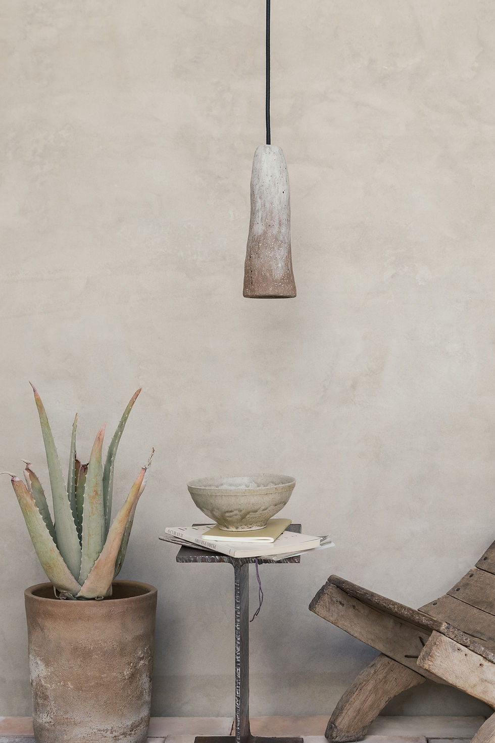 The Burnt Pendant is particularly impressive as a directional spotlight. It is heavy enough for a textile cord to hang straight. The pendant makes a statement on its own and has a significant impact when paired with lamps of different colors from the same series. The Pendant is supplied as ceramic body only, without cord and light bulb.