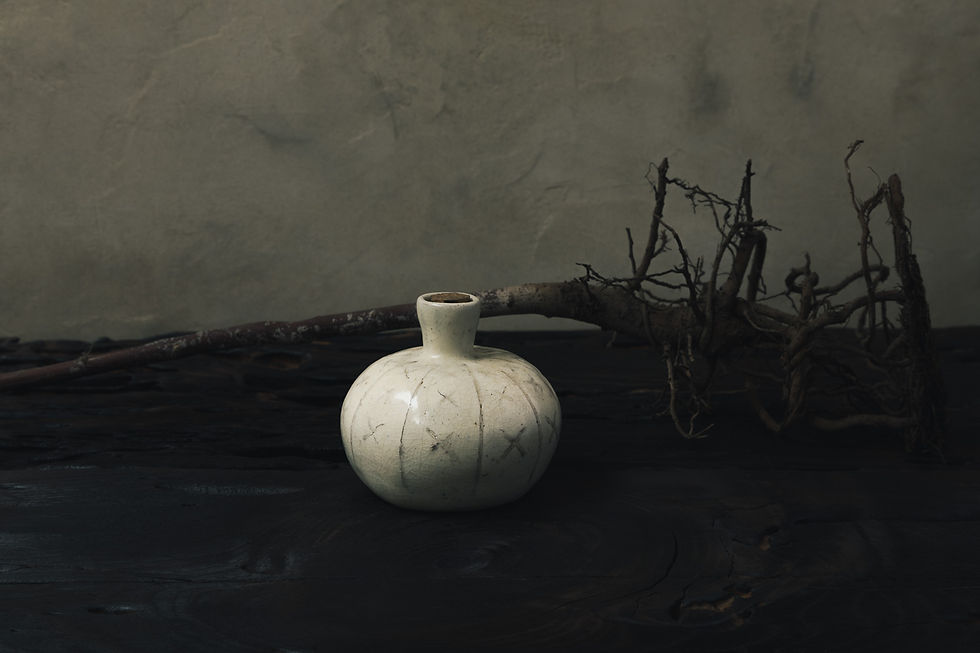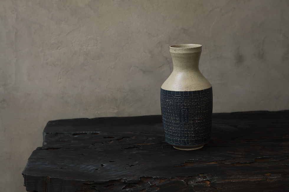 The Cloud Bottle is a vessel made of white ball clay handcrafted by master ceramist Treviño from Mexico City. The white ball clay was high-fired at 1200 degrees in an electric kiln. The surface is covered with a finely measured transparent iron ash glaze that creates a subtle, elegant shimmer. The artist's drawing is created by carving a black slip. The pattern of this particular artwork refers to three-dimensional spaces and a cloud in a window.
