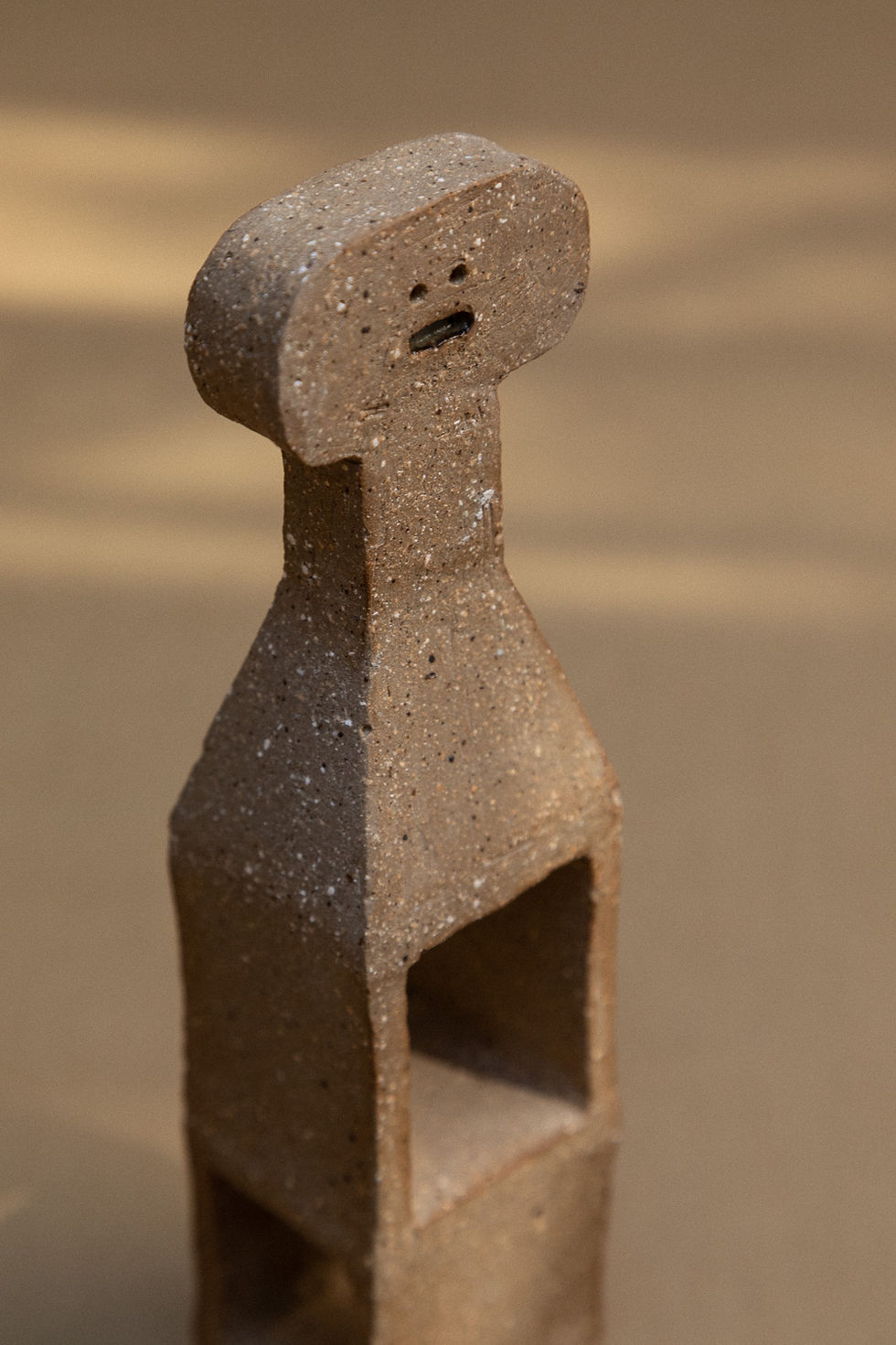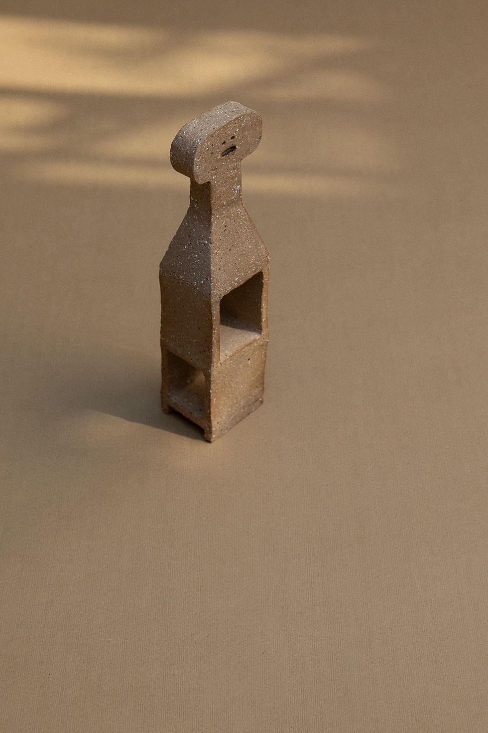 The Citizen is an architectural sculpture handcrafted by master ceramist Treviño from Mexico City. The Citizen is made of red ball clay, high-fired at 1200 degrees in an electric kiln. The untreated surface stands out for its intrinsic mineral character. The corpus of the sculpture carries two windows. The artist experiments in this particular work of art with the abstraction of men made architecture.