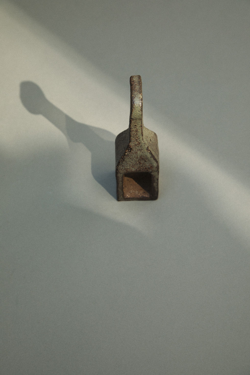 The Iron Citizen is an architectonic sculpture handcrafted by master ceramist Treviño from Mexico City. The red ball clay was high-fired at 1200 degrees in an electric kiln. The surface is covered with a glaze of iron ash, which results in a greenish finish. The lower bottom of the sculpture carries a window. The artist experiments in this particular work of art with the abstraction of men made architecture.