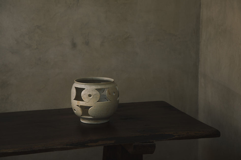 The Celosía is a vessel handcrafted by the master ceramist Treviño from Mexico City. This work of art made of white ball clay was high-fired at 1200 degrees in an electric kiln. The surface is finished with a transparent ash glaze that creates a subtle, elegant shine. The representational patterns juggle between abstraction and figuration of architectural landscapes. Celosías, which are architectural lattices, limit spaces and provide natural ventilation.