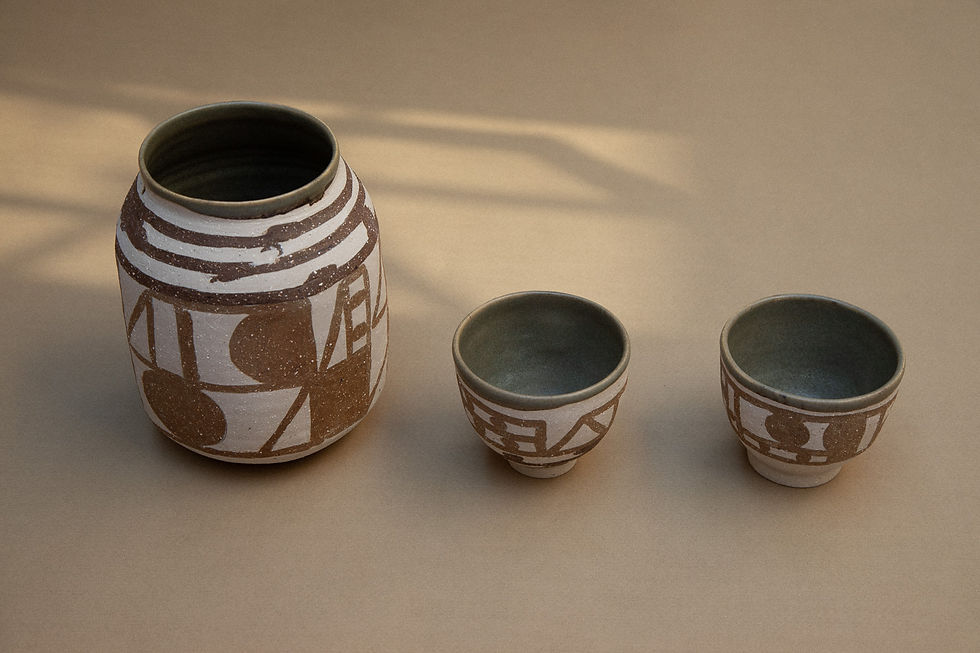 The Peekaboo from the series Monkey Bars is a small cup handcrafted by the master ceramist Treviño from Mexico City. The abstract architectural drawing is realized through the use of three different types of clay. A gentle green ash glaze has been applied to the inside of the vessel. In this artwork, the artist humorously experiments with the abstraction of playground elements, which consist of a structure of metal bars. "It's as if the shapes of playful little humans are peeking through, just begging to be recognised!"