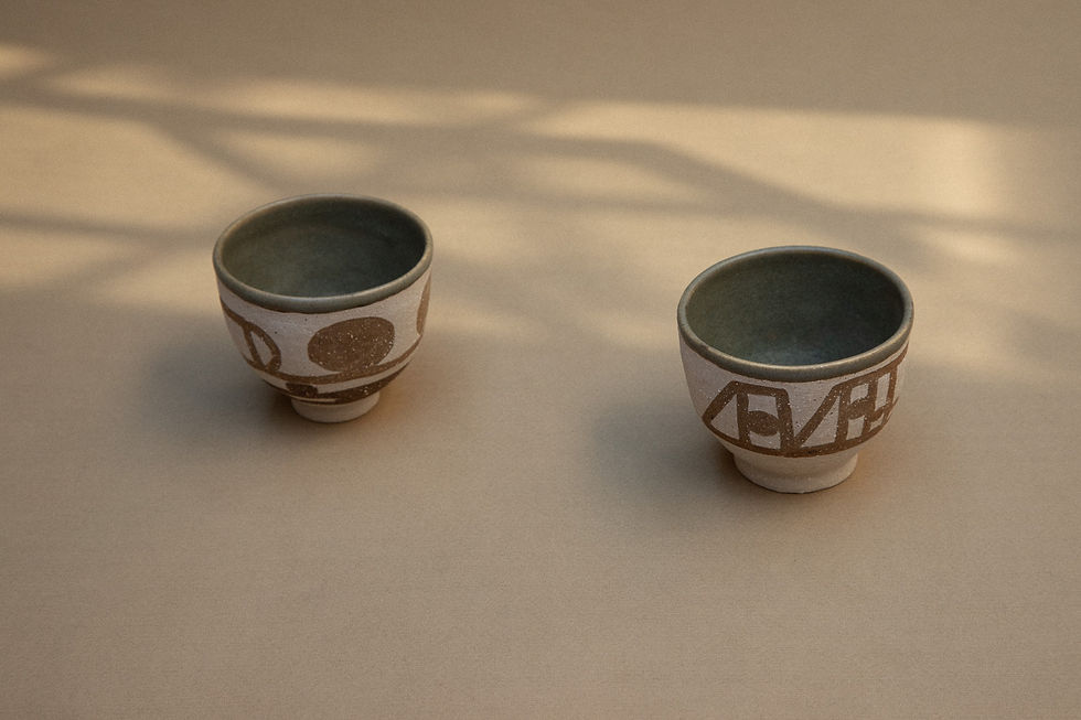 The Monkey Bars Twin is a set of two small cups handcrafted by the master ceramist Treviño from Mexico City. The abstract architectural drawing is realized through the use of three different types of clay. A gentle green ash glaze has been applied to the inside of the vessel. In this artwork, the artist humorously experiments with the abstraction of playground elements, which consist of a structure of metal bars.