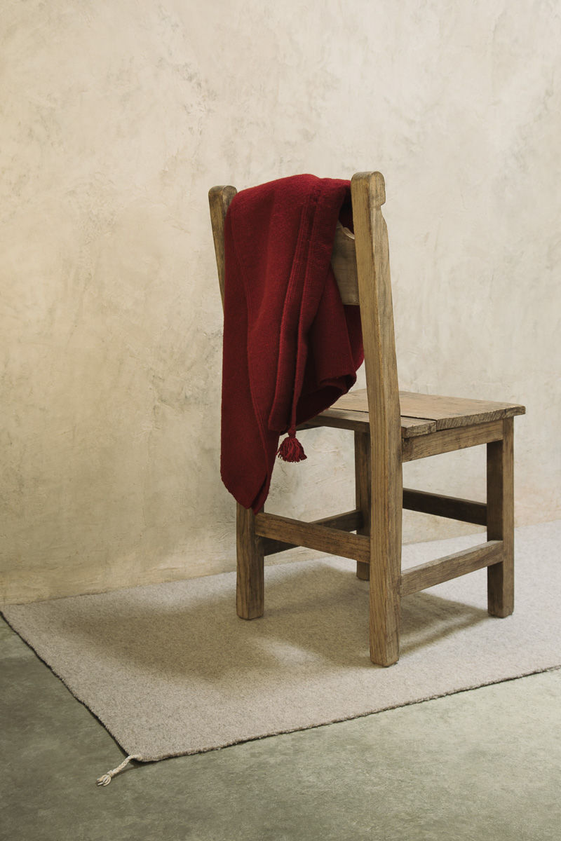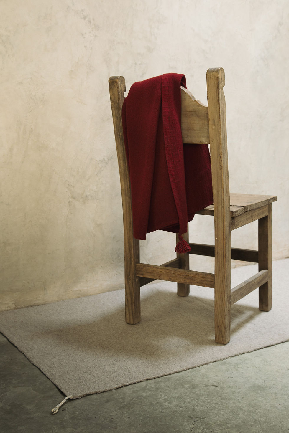 The Deep Red is a woolen throw woven on a traditional flying shuttle pedal loom. The medium heavy twill throw refers to the wrap-around skirt Enredo or Pozahuanco reflecting race and tradition dating back to the ancestors of the habitants of the Central Valleys of Oaxaca. One corner of the throw is adorned with a little tassel as a remnant of the origin use of the textile. The Deep Red refers to the traditionally used Grana Cochineal, a natural pigment gained from crushed insects harvested on the nopal cactus.
