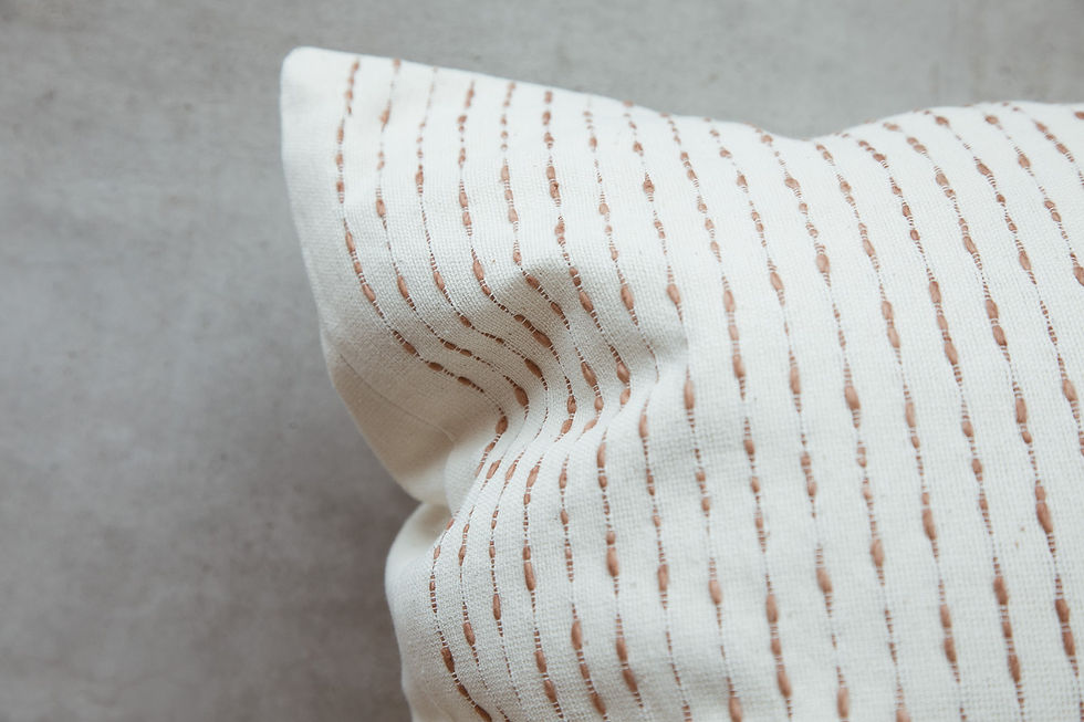 The finely woven cotton Pillow Cover Adobe was crafted on a traditional flying shuttle loom in the Central Valleys of Oaxaca. The front side of the pillow features a woolen diamond pattern referring to Mayan Spirituality. The backside is plain cotton, maintaining its soft feel, thanks to an envelope closure. The beauty of the fabric lies in its delicate charm and elegance, harmonizing with the all-over embellishment.