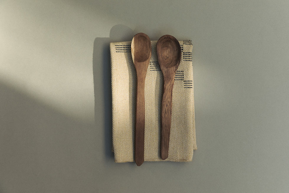 The intricately handcrafted wooden utensils embody the convergence of craftsmanship and appreciation for natural aesthetics, expressing tranquility and simplicity. The organic forms accentuate the beauty of each piece.